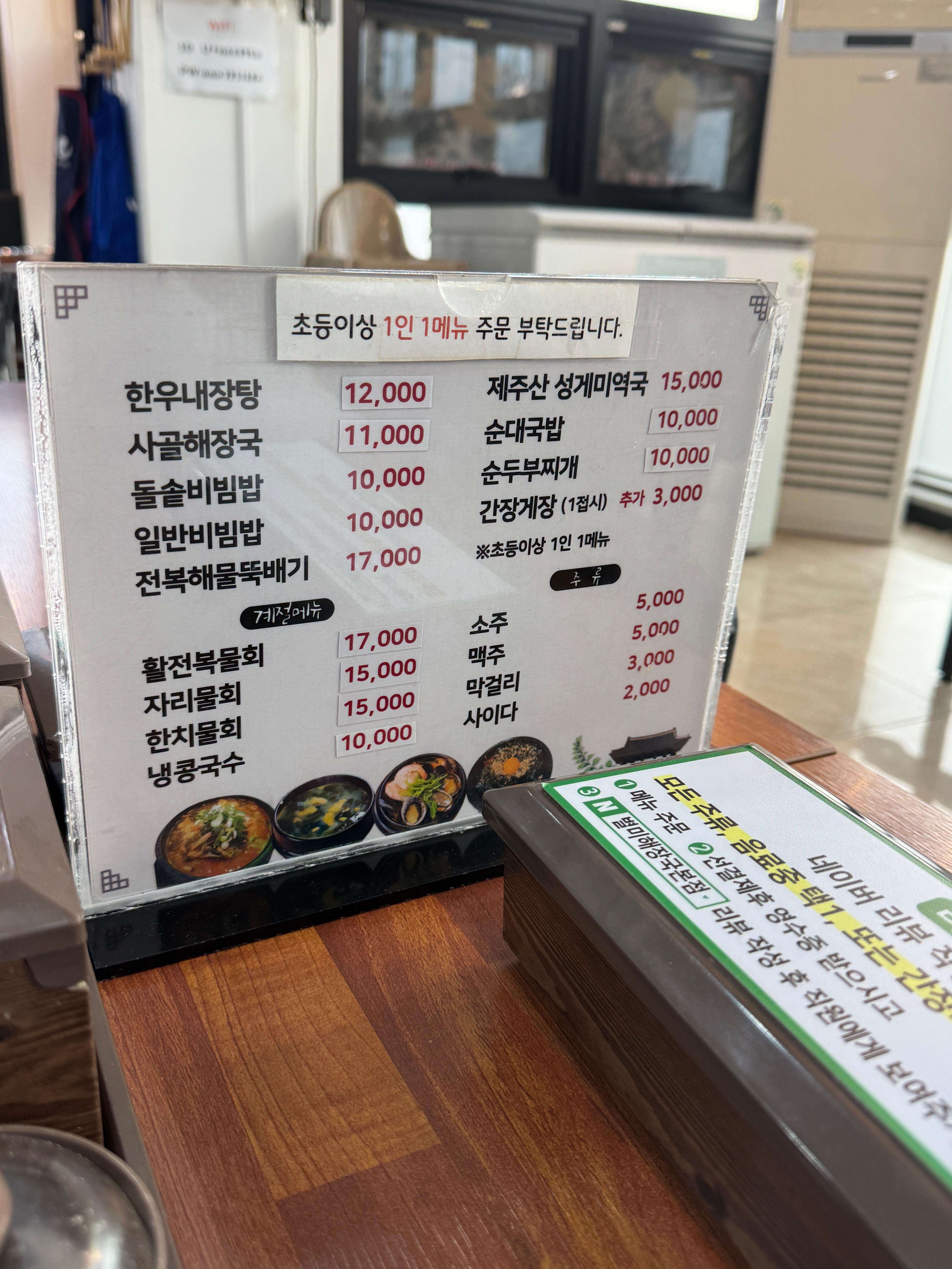 | 기타 메뉴 | 성게미역국, 전복뚝배기, 물회, 콩국수 등 |
