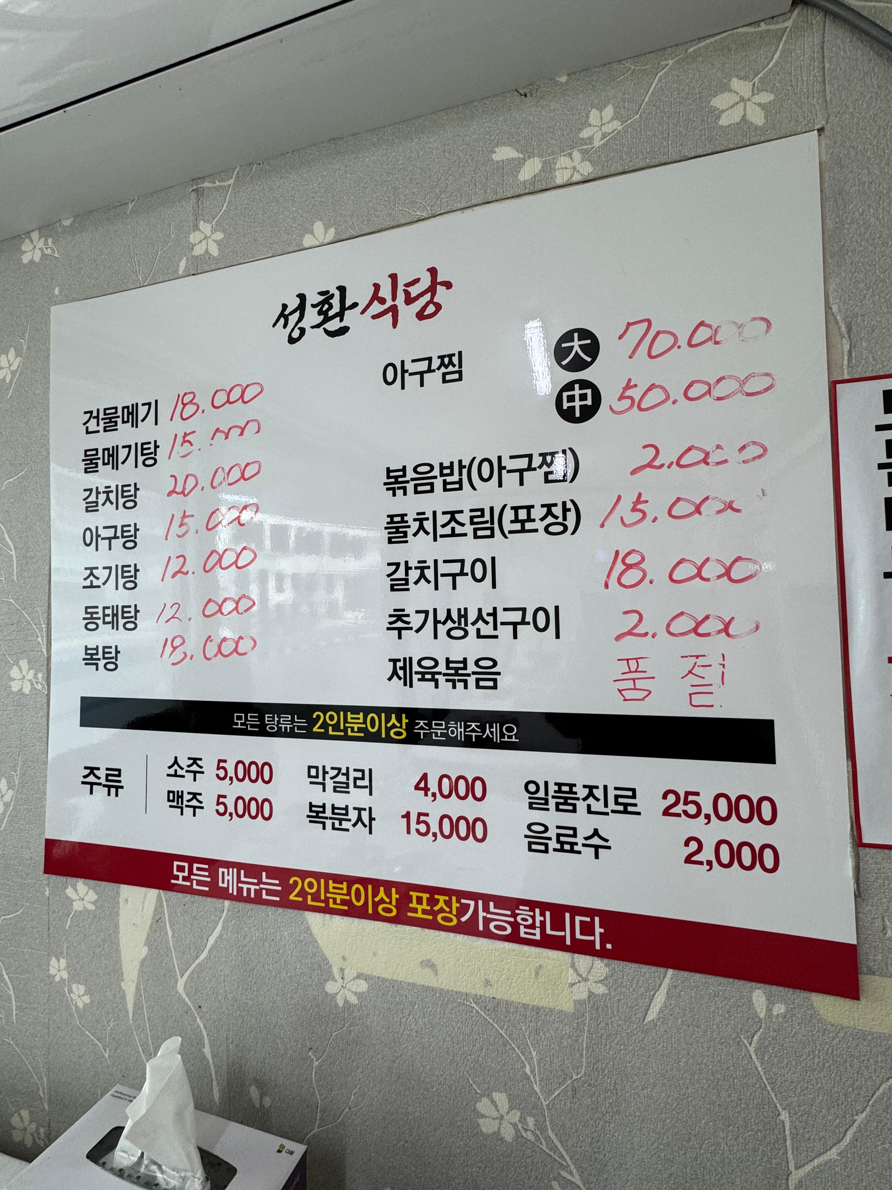 | 물메기탕 (2인분) | 약 30,000원 |