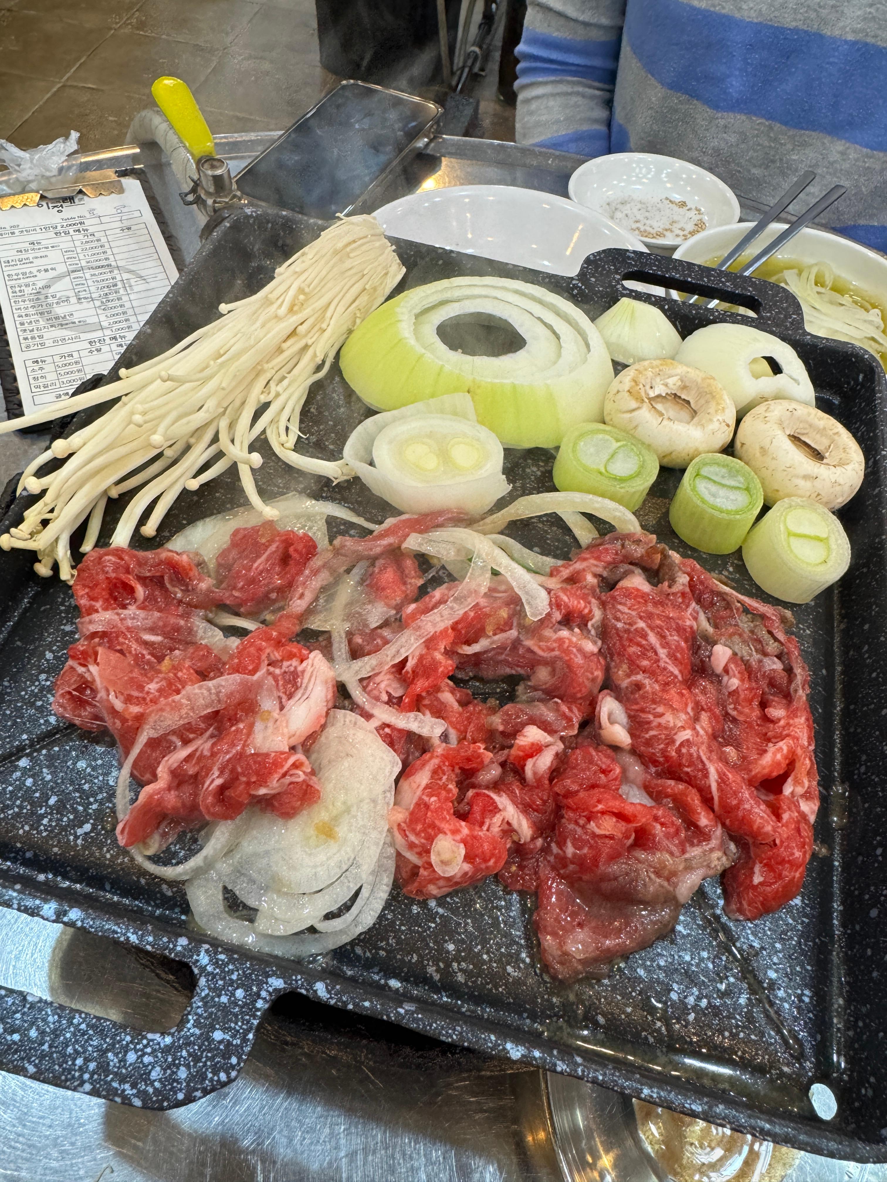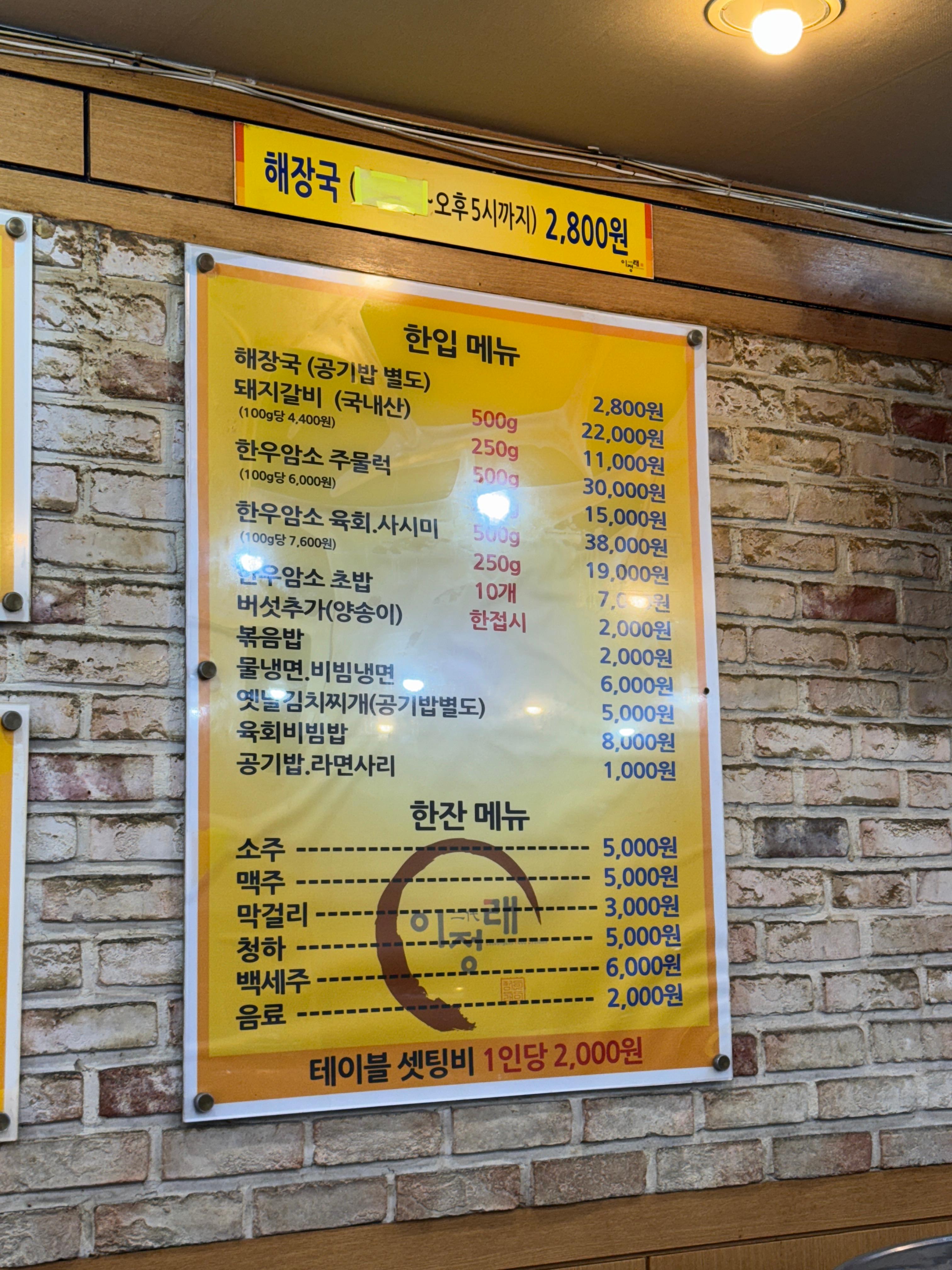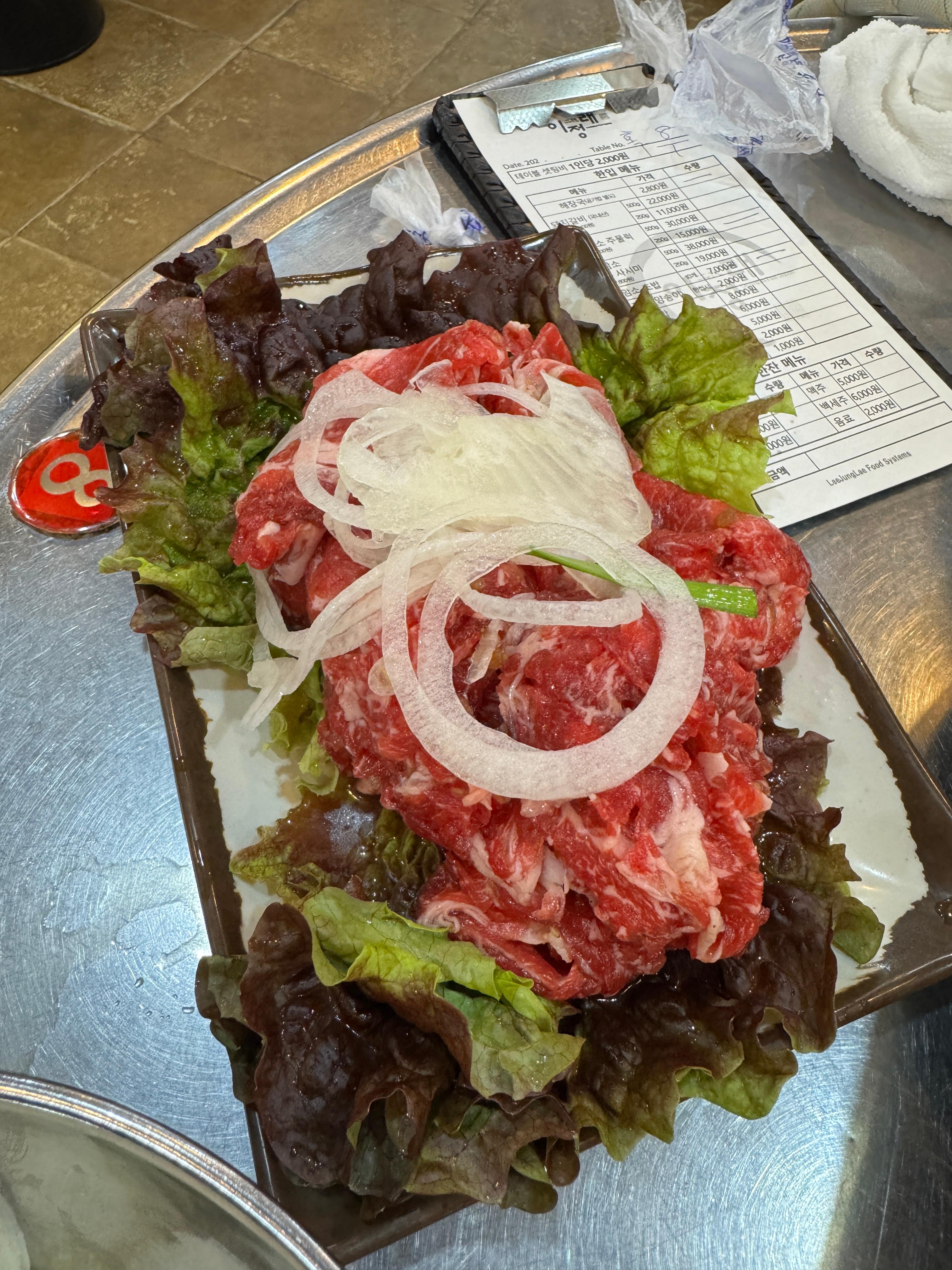 | 한우암소 육회 / 사시미 | 고기 질 좋다는 평 많고, 회 종류로 인기 있음 | 500g 약 ₩38,000, 250g 절반 사이즈 있음 |