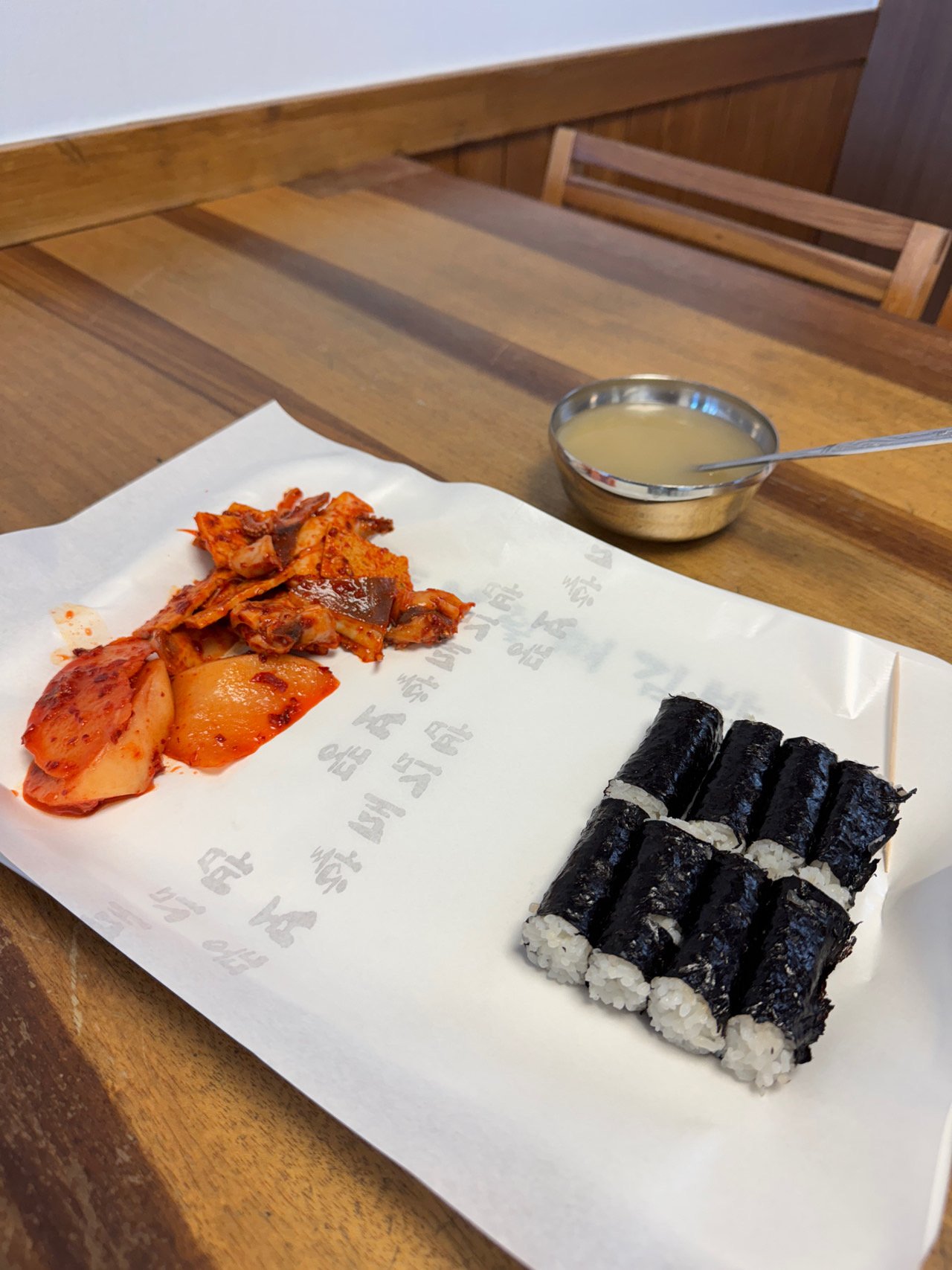 - 메뉴 구성은 충무김밥 + 반찬류 (오징어 무침, 어묵, 섞박지 등) + 시락국 등 국물 제공됨