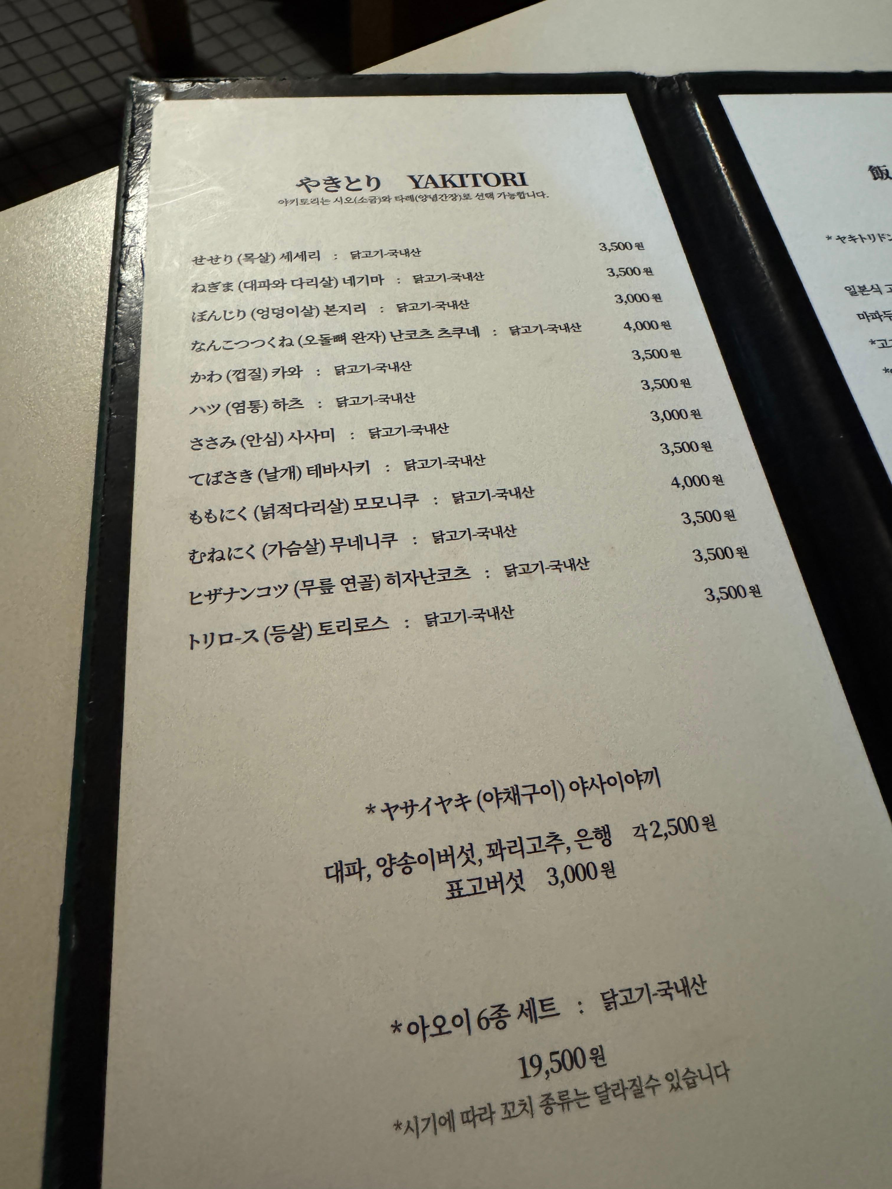 | 단품 꼬치류 | 네기마(닭다리 + 대파), 안심, 날개, 염통, 넓적다리살, 오돌뼈 등 다양한 부위. 가격 대체로 ₩3,000 ~ ₩4,000 꼬치 하나 기준. |