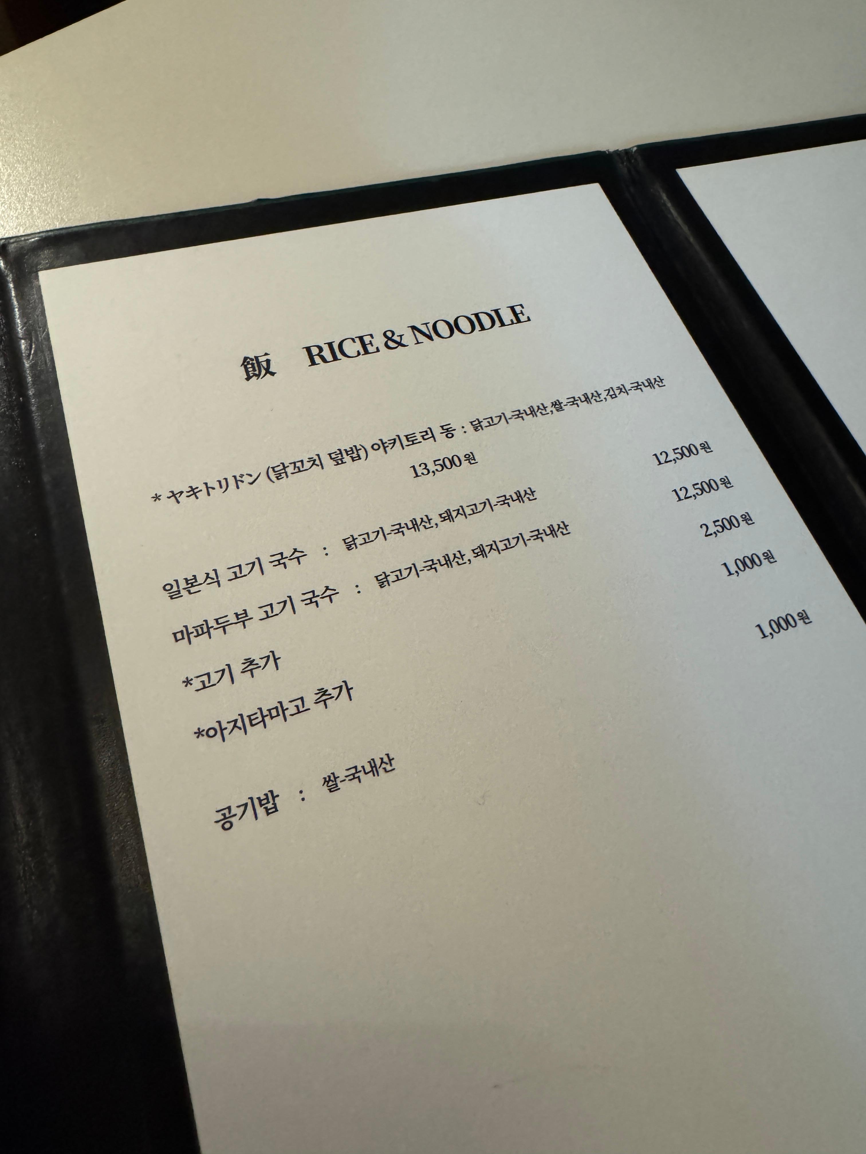 | 닭꼬치 덮밥 (야키토리동) | 대표 식사 메뉴. 여러 부위의 닭꼬치 + 밥 조합. 가격 약 ₩13,500 |