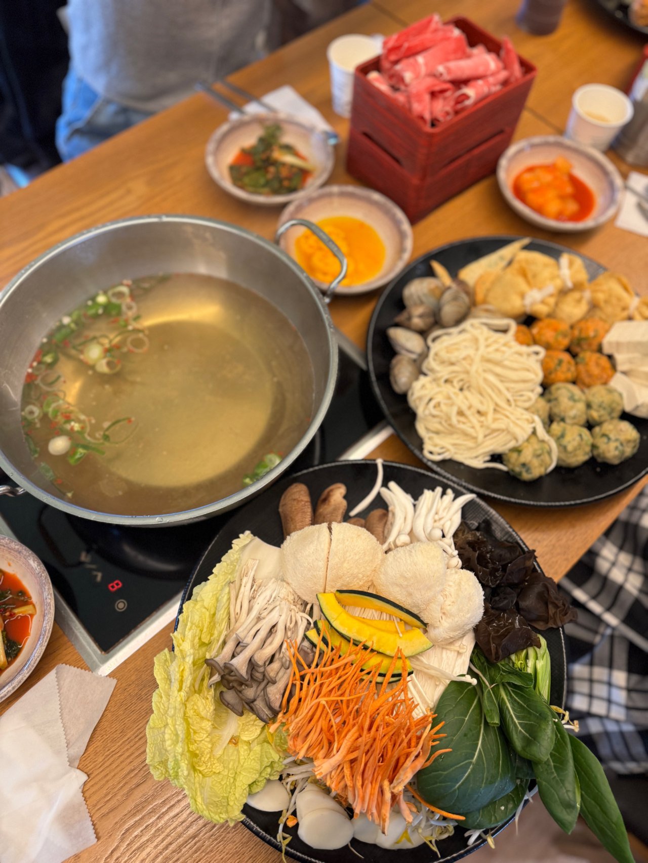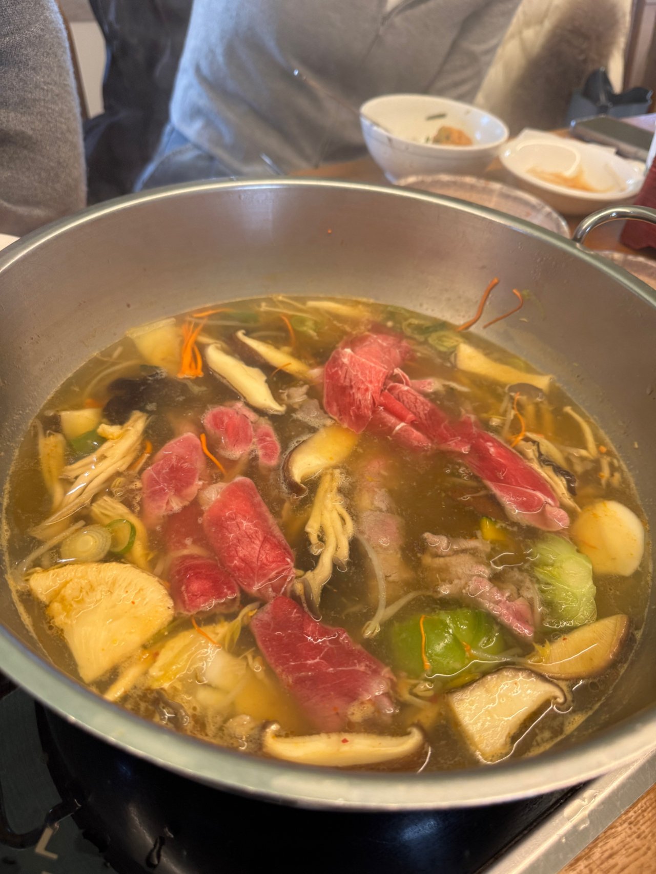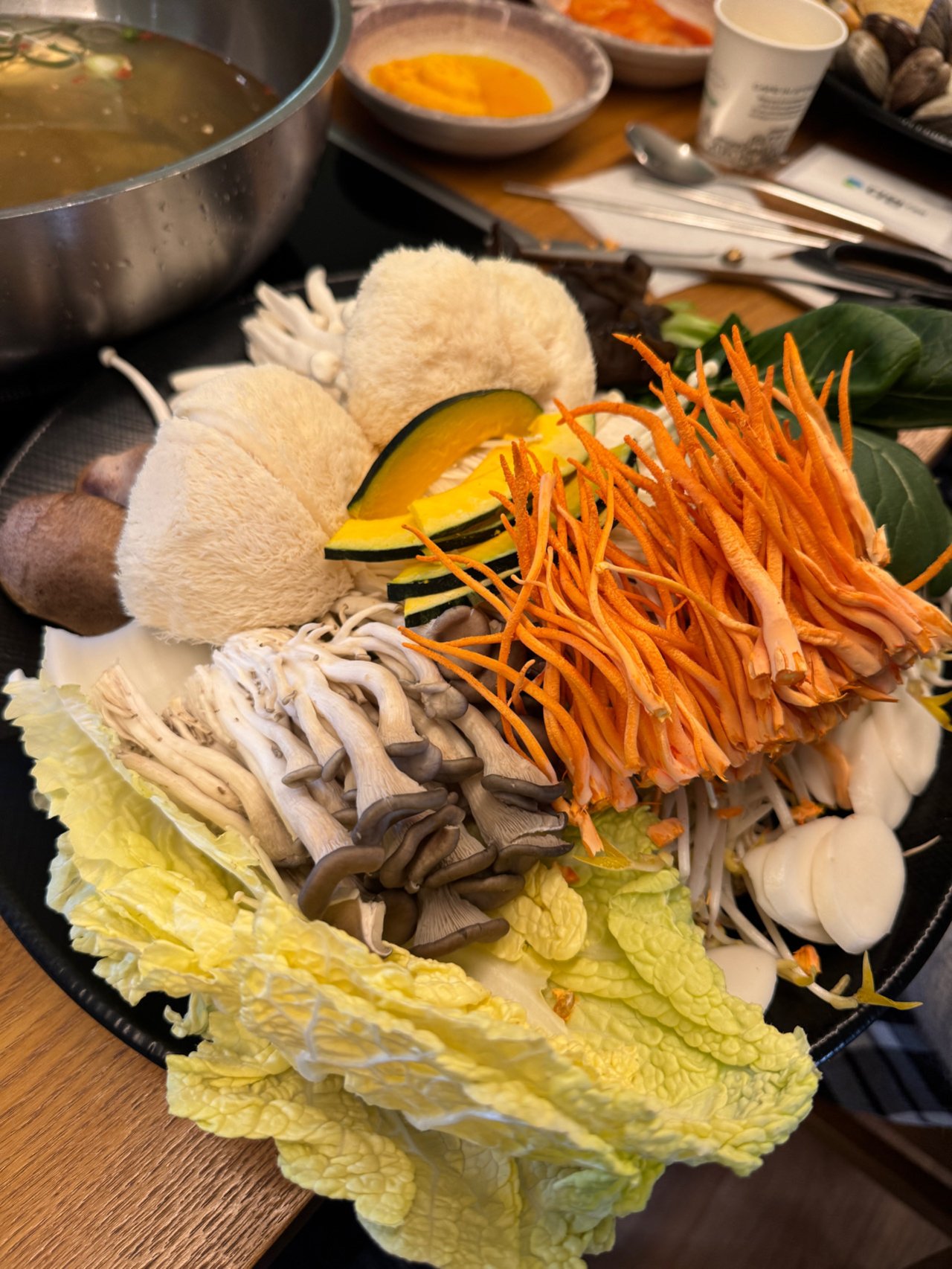 버섯 종류가 많고 (동충하초, 노루궁뎅이, 황금팽이, 표고, 새송이, 느타리 등) 야채/조개/만두 등이 골고루 나와서 맛과 식감이 다양함. - 육수 & 만두의 조합