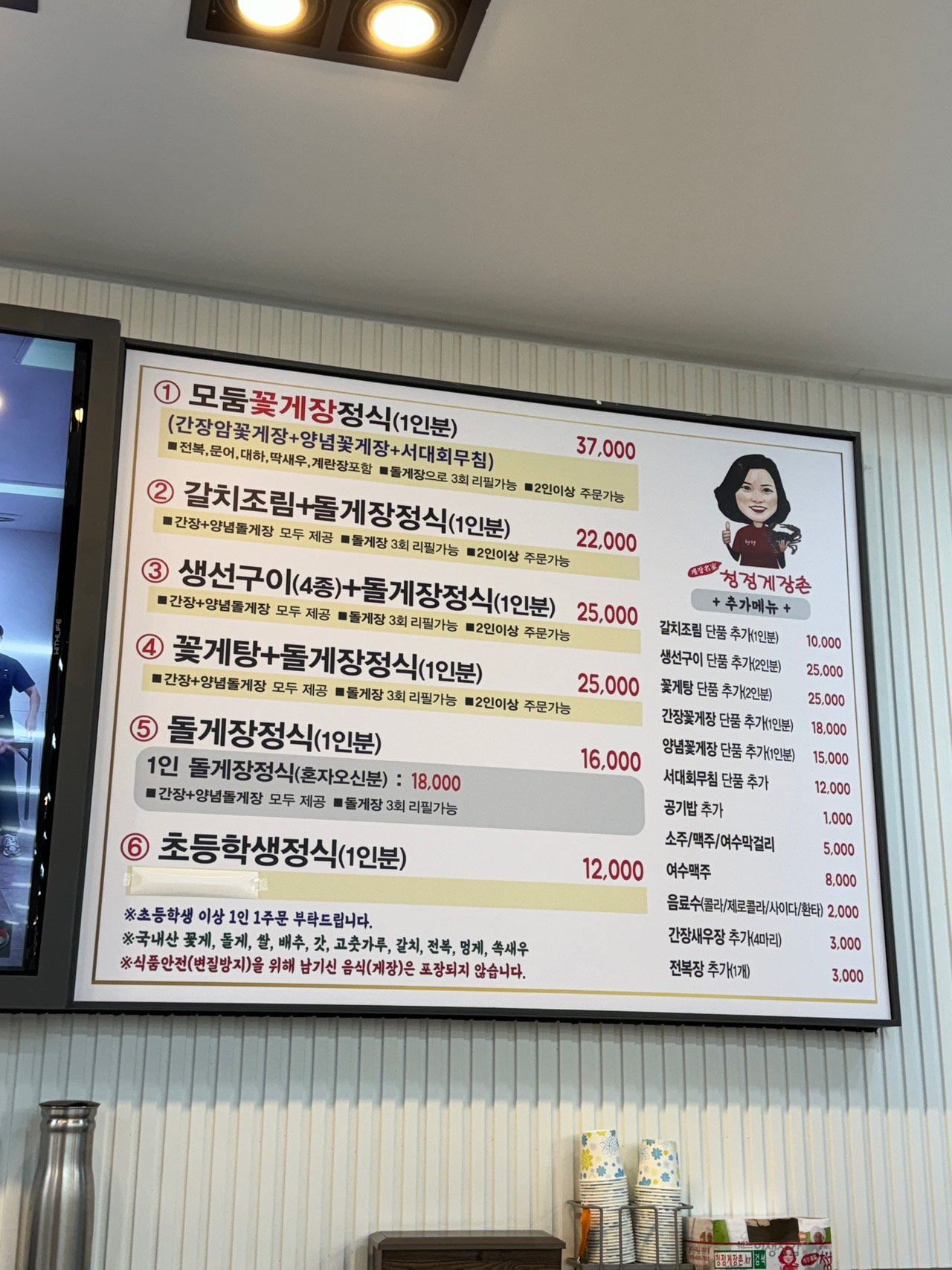 | 돌게장 정식 (1인) | 간장 돌게장 + 양념 돌게장 + 새우장 + 밑반찬 구성 |