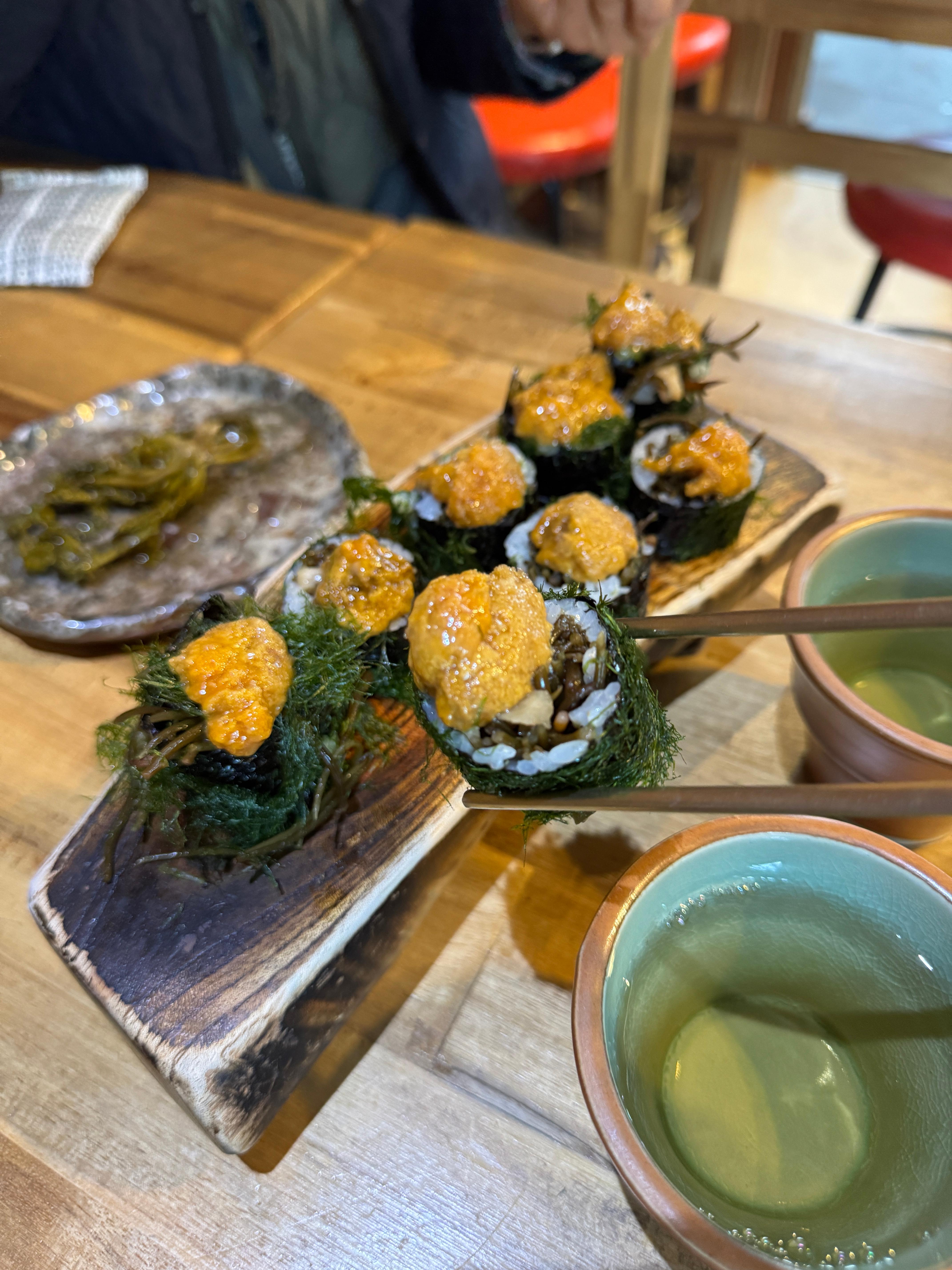 - 성게김밥이 시그니처 메뉴로, 한 줄에는 마라도 성게알이 올라가 있습니다. 톳이 들어간 김밥 위에 성게알이 올라가는 고급스런 구성이에요